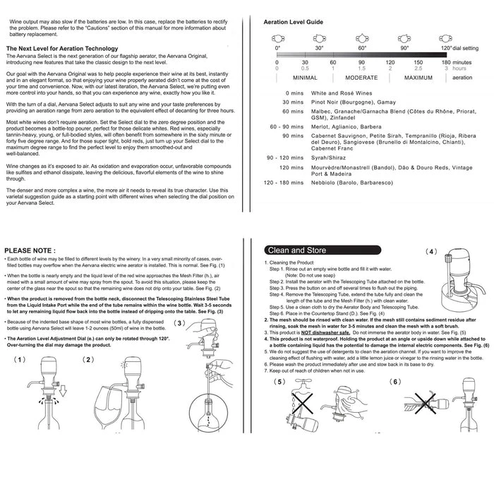 The Select combines Aervana’s patented push-button technology for a seamless, one-touch pour with an all-new variable aeration dial, allowing users to select the amount of air infused with the wine to fine-tune the aeration effect per the wine being served. For bold reds, the Select allows you to dial-up the aeration effect to smooth-out harsh tannins. For a light-bodied white, you can pour a glass from your personal wine tap without running the risk of stripping its flavor. And with the seamlessly-progressing dial, you can experiment with any setting in-between to find the perfect level of aeration to suit your preferences and the character of the wine. The stainless steel tube included with the Select telescopes to accommodate both standard (750 ml) and magnum-sized (1.5L) wine bottles and contains a sediment filter. Product includes one stainless steel telescoping tube, the countertop storage stand and the Aervana body. Non-drip dispenser spout to table-top provides more than 10inches clearance for the largest size wine glass. Powered by 6 AAA 1.5V batteries (batteries not included). Aerate and dispense more than 100 bottles of wine (average bottle being 750 ml) per set of batteries.