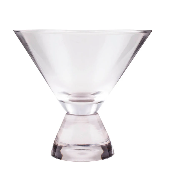 This martini glass is an eloquent piece of glassware to serve your guest and patrons. This glass is stemless and features a weighted base. It is made out of durable crystal clear glass that is heavy duty and built to withstand daily use. It has a height of 4.25″ with a rim diameter of 4.75″ Has a liquid capacity of 10 ounces.