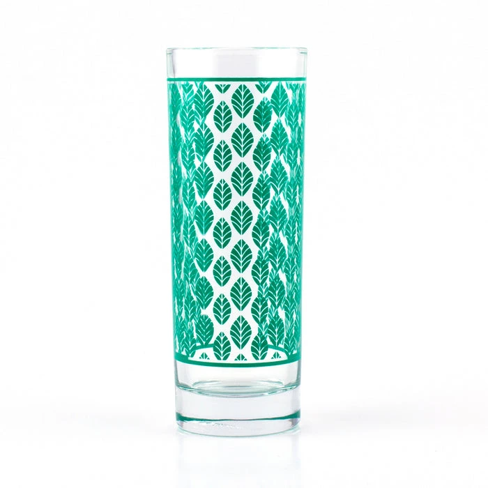 Inspired from a vintage vibe, this retro green leaf pattern collins glass is certainly one to add to your unique glassware collection. Perfect for serving up your refreshing craft cocktails, this glass showcases a highly trending retro element. The vibrant green imprint is durable and scratch resistant, looking gorgeous while it illuminates around the liquids inside.