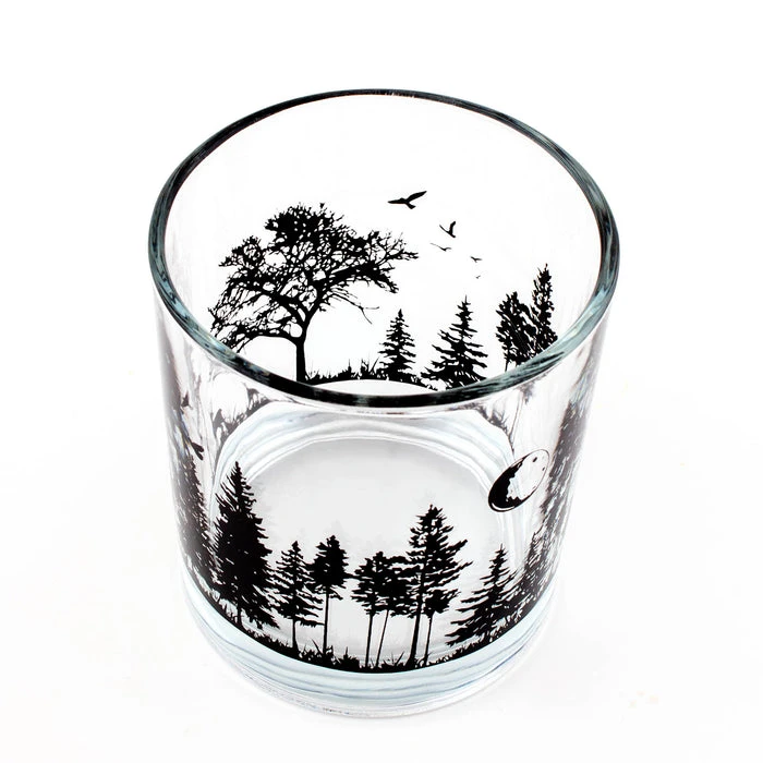 This old fashion glass is a truly unique piece to have in your bar. The glass itself is molded from a thick, durable weighted material that you are sure to find appealing while maintaining an ultimate clarity. It features a full wrap around design of a forest setting with everything that gives you the feeling of being outdoors. These features include a beautiful landscape setting with deer and trees with a beautiful moon and birds flying in the sky.