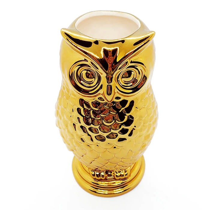 BarConic® gold ceramic great horned owl tiki mug. Made of high quality durable ceramic, hand painted and glazed with fine detail. Whether you’re crafting up delicious cocktails at home or at a tiki bar, guests will certainly love drinking from this elegant tiki mug. Measures 7 1/8″ H x 3 3/8″ W x 1 5/8″ Rim. Holds 24 oz.