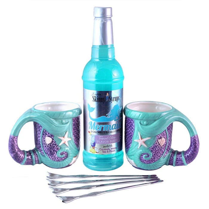 Always be yourself, unless you can be a mermaid. Then always be a mermaid! This fun mermaid set also makes for an excellent gift idea! The tropical citrus flavor burst of this 0 Calorie, 0 Sugar and 0 Carb skinny mix compliments cocktails, water, teas and more making it perfect for any type of mermaid! Serve up your tasty concoctions in these adorable ceramic tiki mugs accented with a stainless steel mermaid tail stirrer. Your guests will LOVE them!
