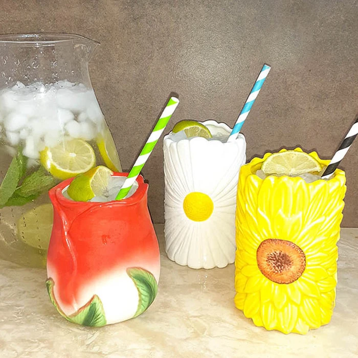 Spring collection of 3 BarConic® ceramic flower tiki mugs. Hand painted and glazed with fine detail. Serve your exciting libations in these cute vessels. Red Rose measures 4″ H x 3 1/2″ W x 2 1/8″ Rim. White Daisy measures measures 4 3/4″ H x 2 7/8″ W x 2 1/4″ Rim. Yellow Sunflower measures 4 3/4″ H x 2 7/8″ W x 2 1/4″ Rim.