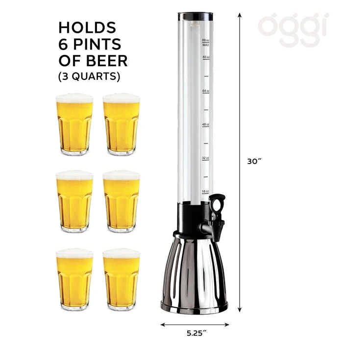 Impress your guest with this stunning beer tower. This tower comes with a removable pre-filled ice cube tray that allows beverages to stay colder longer. It also has a weighted stainless steel base to keep the dispenser in place. To top it off it has an easy pour spigot so you can get a smooth pour every time. It stands 30″ in height and has a base diameter of 5.25″. This Dispenser has a liquid capacity of 3 quarts which is equivalent to 6 pints of beer. Comes in two color options.