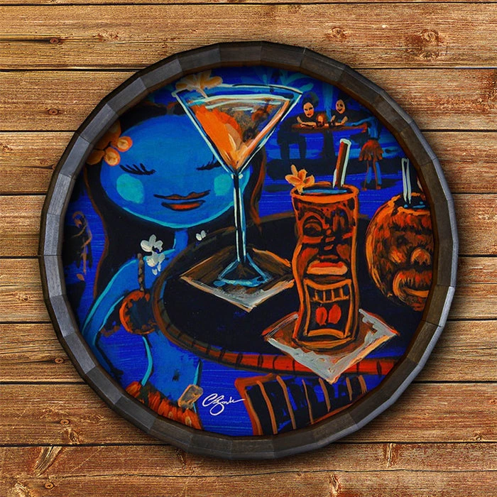 This barrel top sign is made in the USA, and handcrafted in our own woodshop. The print on the wood features beautiful vibrant colors, and is perfect for tiki or home bars!