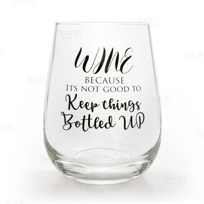 “Wine – Because it’s Not Good to Keep Things Bottled Up.” Sip your favorite wines and other cocktail refreshments out of this fun imprinted stemless glass! The shape of this glass makes it great for wine, signature cocktails, or even craft beers!