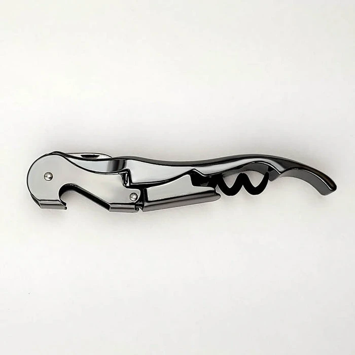This stunning gunmetal plated corkscrew features a non-stick coated spiral that easily forms into the cork of your wine bottle. It offers a boot lever system that provides a simple cork extraction. The serrated blade is ideal for bottles that need a packaging seal cut through prior to removing the cork. Known as a waiter’s corkscrew, this small wine opener is the frequent choice for most bartenders and waiters. This popularity is attributed to versatility and diverse functionality of this device despite its compact size. This double lever corkscrew is a necessity in any nightclub or bar. It fits securely in any pocket and has the capability to open beer bottles just as well as wine bottles. This double lever corkscrew measures 4 3/4″ in length.