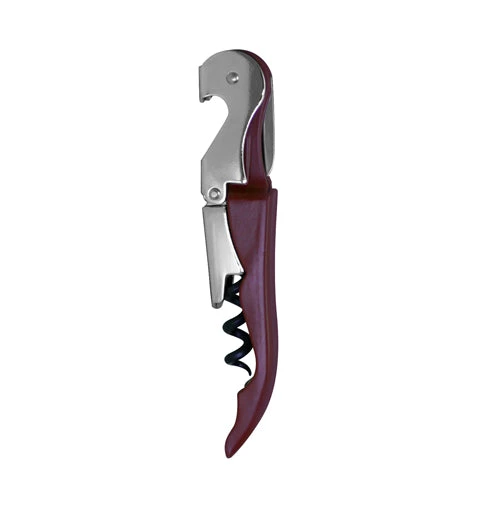 This stainless steel double lever corkscrew features a double lever boot system which aids in the effortless removal of wine corks. The boot lever and serrated foil cutter are stainless steel making this device durable and long lasting. The screw is Teflon coated to ensure that it slides smoothly into the cork without breaking or damaging it. Known as a waiter’s corkscrew, this small wine opener is the frequent choice for most bartenders and waiters. This popularity is attributed to versatility and diverse functionality of this device despite its compact size. This double lever corkscrew is a necessity in any nightclub or bar. It fits securely in any pocket and has the capability to open beer bottles just as well as wine bottles. Available in three styles: Stainless Steel, Maroon or Black; all constructed of sturdy stainless steel. Measures 4.75″ when closed.