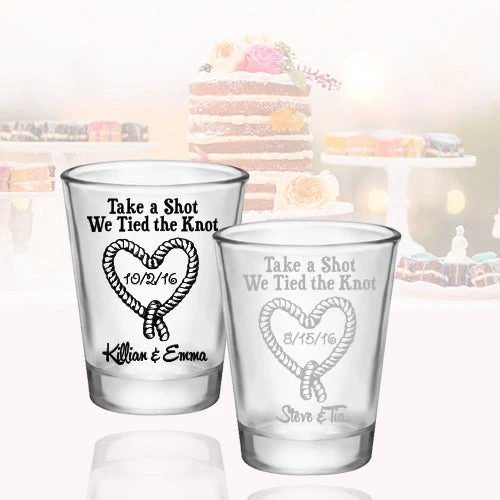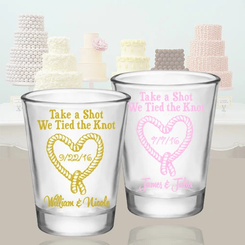The “Tied the Knot” wedding themed shot glasses make for the perfect favors to commemorate your special day! Customize with your names and the memorable date. Our team of expert designers will take the information you provide and layout it out on this cute template design. You can even select from a variety of ink colors.