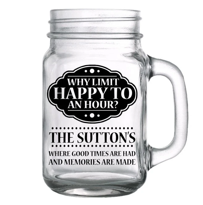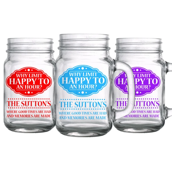 This 16 ounce Mason Jar with Handle is one of our best sellers. It showcases a high quality clarity and looks fantastic with our custom screen printing process. The ink will not wash off in the dishwasher, sending your personalized message for years to come.