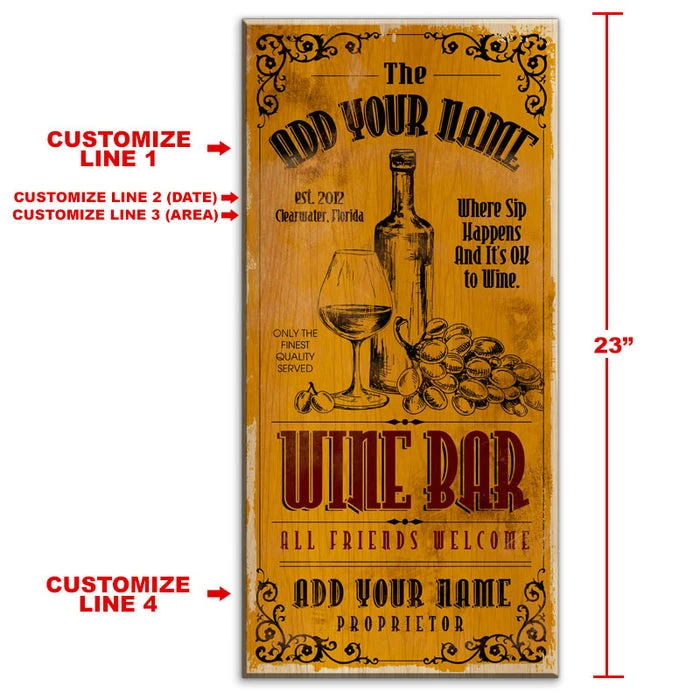 Home and bar decor can certainly set the tone for your guests. They can also make for great conversation pieces! This distressed, Vintage Style “Wine Bar” themed Wooden Sign will do just that. The best part is that it is completely customizable. All you need to do is simply type in the required fields with your text and we will custom design this very cool, distressed wooden sign just for you. Think about how excited your friends and family will be when they receive this gift personalized with their name or favorite phrase.