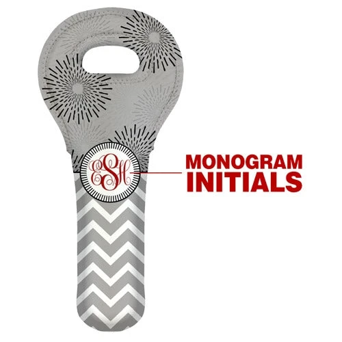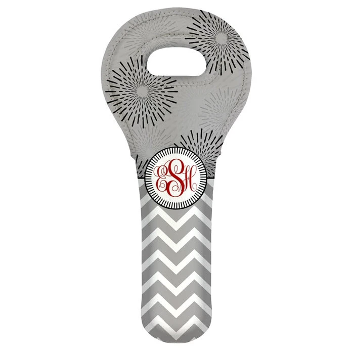 Looking for the perfect gift and/or way to transport your favorite wine bottles safely? Not only do these wine totes offer a superior bottle protection and convenient toting utility… but they are also adorable! This fun customizable GRAY SUNBURST CHEVRON design is cute and will be great any time of the year. This wine tote features a customizable monogram that is the same on both the front and back.