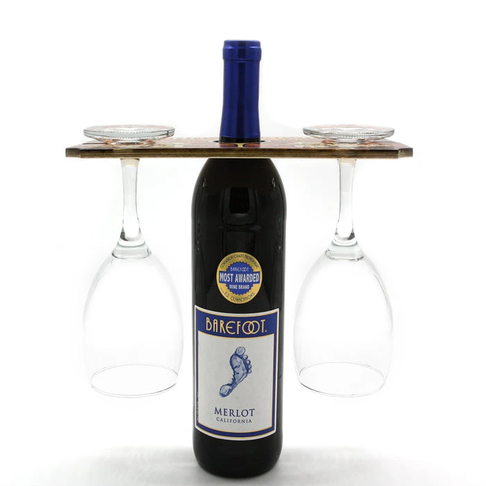 This beautifully rustic wooden Wine Glass Caddy is an exceptional addition to any type of bar or home setting! Our Wine Glass Caddy makes for a wonderful Housewarming gift, Custom Wedding gift, and a unique anniversary gift for the kitchen. The quality craftsmanship (handmade in our Woodshop USA) is beyond compare. This caddy allows you to carry 2 glasses of wine and a bottle of wine all in one hand. It also can be stacked with another caddy to hold 4 glasses! It also comes with 2 of our BARCONIC® 12 OZ WINE GLASSES!