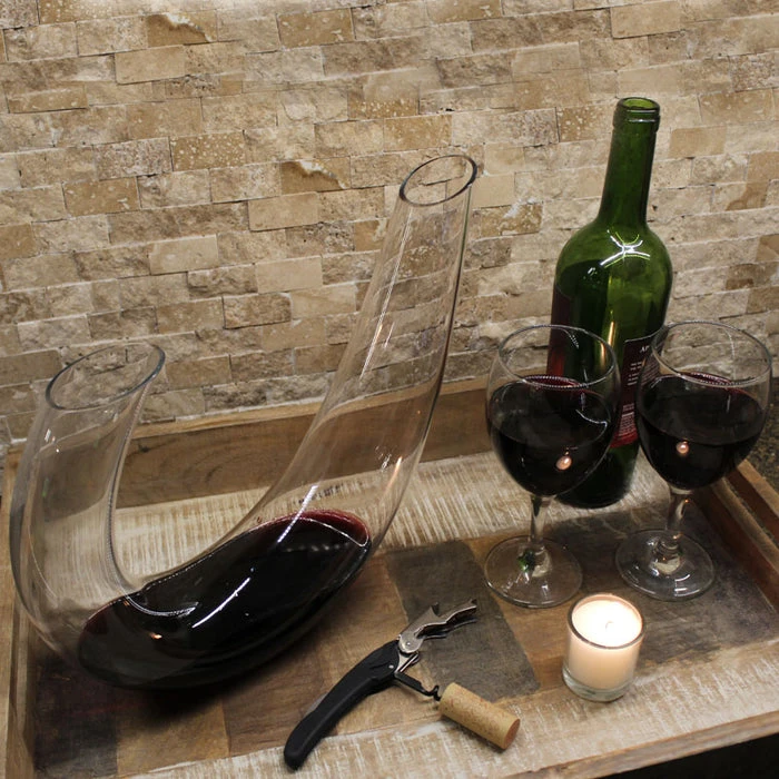 Decanting is simply transferring the wine from the bottle to another container. When you pour in and out of the glass decanter, the wine travels over specially designed curves, maximizing the scent and flavor of your favorite wine. This mouth-blown decanter is geometrically designed offering its unique shape. Holds a full wine bottle for complete aeration. Made of lead free crystal. Measures 10.5” in height.