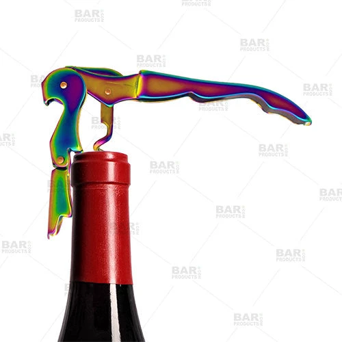 This multi-faceted double hinged corkscrew is cast in beautiful iridescent rainbow colors. And it’s not just lovely to look at, it’s also a great tool for every wine lover. Complete with an integrated bottle opener, a 5 turn worm, and a serrated foil cutter. The stainless steel build makes for a strong durable product that will be with you for a long time. So not only is this set visually striking it is also highly functional and the trendy coloring will stand out and pop in any club or bar!
