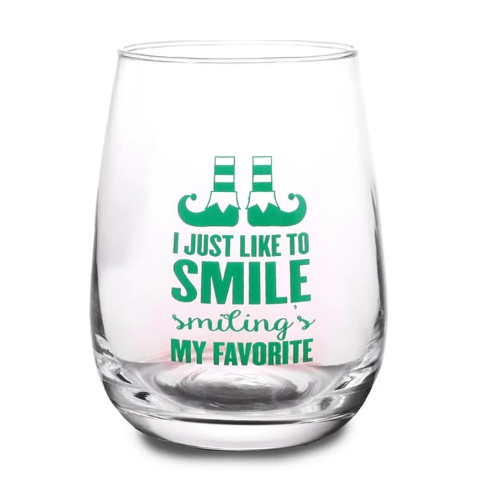 Whether you are enjoying your favorite spirits at the North Pole or by a cozy fire, the I Just Like to Smile Stemless Wine Glass is the perfect glass! The Elf themed glass is perfect for use during the holidays or all year long. The shape of this glass makes it great for wine, signature cocktails, or even craft beers!