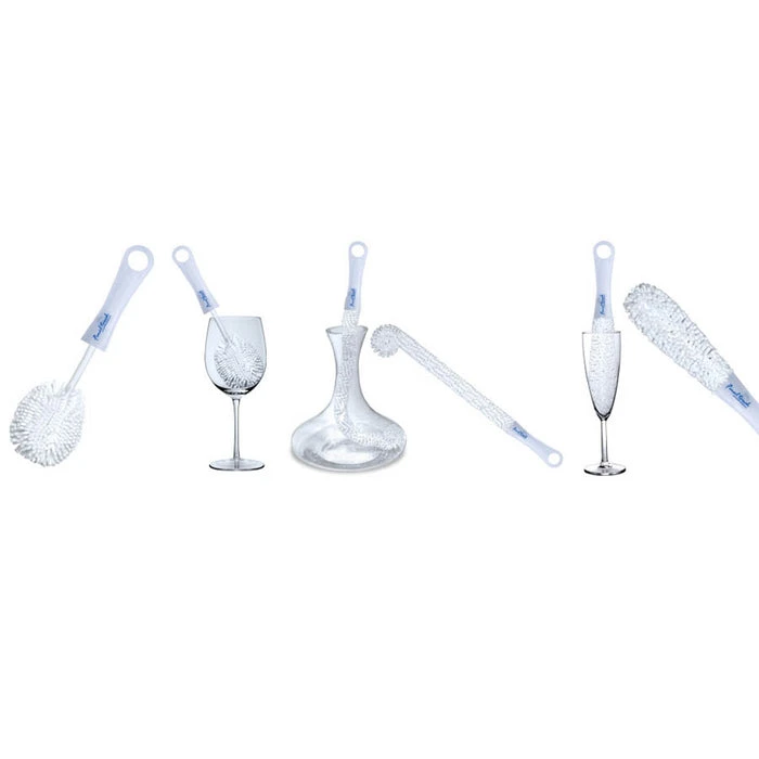 Every kitchen needs a good set of glass cleaning brushes, and this trio is a must have. These flexible brushes are perfect for hand washing all of your delicate glassware and fine crystal. All 3 are made of synthetic materials that will not scratch or damage glasses, and that keeps bacteria to a minimum. Can be used for decanters, fluted glasses, wine glasses, vases, baby bottles, beer mugs, water bottles, travel coffee mugs, or any difficult to clean item.