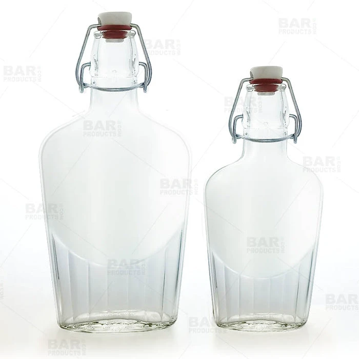 Available in 2 sizes, these flask shaped glass bottles are constructed of a thick high quality material and will withstand typical service abuse.