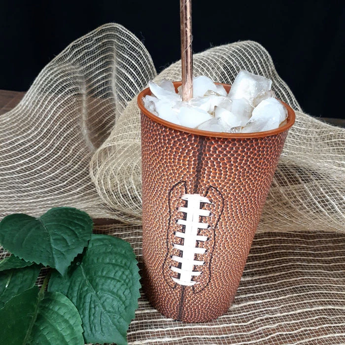 This tall plastic football cup is perfect for any Football Lover! Holds 22 ounces making it ideal for your big drinkers. Fill it up at any College, NFL, or High School Football events. Kick the tailgating off with our sturdy cup that displays an up close pigskin football design. Measures 5.5” H x 2 ¾” Base x 3 ¼” Rim.