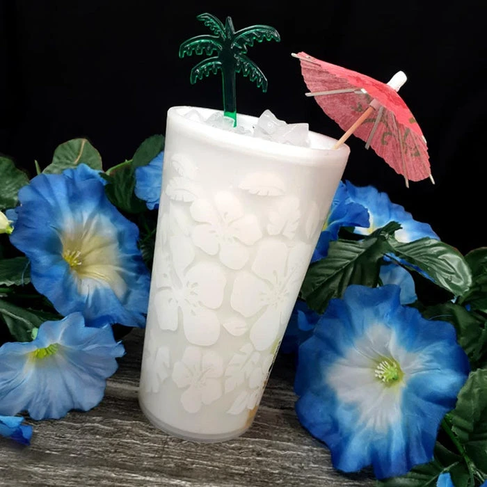 Luau 12 oz Glow Cup with a hibiscus design imprinted on the outside is perfect for Hawaiian themed events. Fun for all ages. This cup will glow 1 time only. Just crack the green glow ampules by squeezing the bottom sides of the cup. Measures 5 ½” Tall x 2 ¼” Base x 2 ¾” Rim.