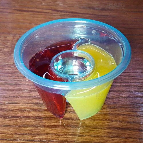 These plastic Bomb SHOTZ® are the smart way to serve up specialty shots- the bright color displays well when serving and they are easily disposable. The inner shot chamber holds a 7/8oz pour and the two outer chambers combined hold 2 1/4oz of liquor or mixers. The Bomb SHOTZ® have ridged sides for easy handling. Sold in packs of 50 with four color options available.