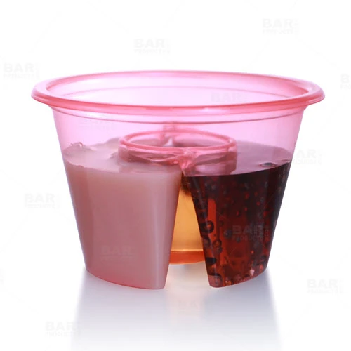 These plastic Bomb SHOTZ® are the smart way to serve up specialty shots- the bright neon colors display well when serving and are easily disposable. The inner shot chamber holds a 7/8oz pour and the two outer chambers combined hold 2 1/4oz of liquor or mixers. They have ridged sides for easy handling. Sold in packs of 50 with four color options available.