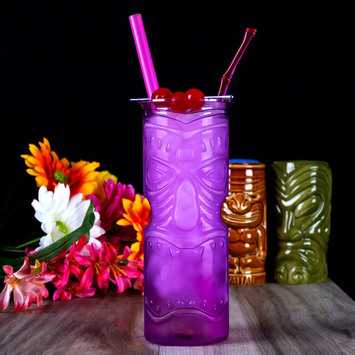 This fun tiki cup is the perfect cup to make your colorfully tropical drinks in. These cups are made of high quality durable plastic material that wont easily break and they feature an embossed tiki face design showcasing a slightly transparent purple color. This cup is 8 1/2 inches in height with a 3.25 inch diameter and can hold 32oz of liquid. The tiki mixology trend is showing no signs of slowing down and we feel it is here to stay. Stock up on these great reusable tiki cups and enjoy one of the best movements in modern mixology.