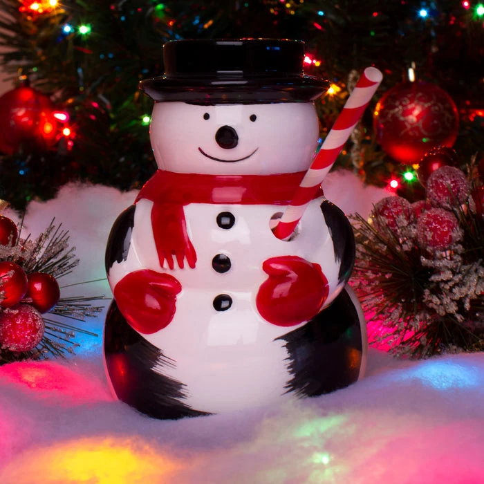 Jump into the Christmas season with this adorable snowman tiki mug. Made of durable ceramic this snowman also features a painted design wearing a scarf and gloves and he comes with a black hat. On the back of this mug is a large hole where you can pour in your favorite drink and the front of the mug has a hole where you can insert a straw. It measures 5.75″ tall x 4″ wide and holds 10oz of liquid. His happy face is sure to be a great addition to your Christmas collection.