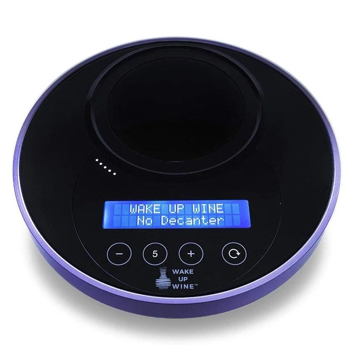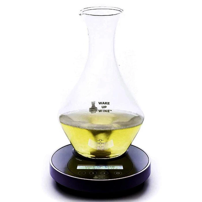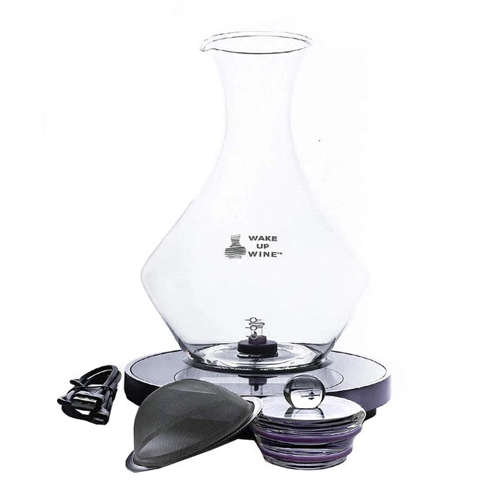 This is the next essential restaurant (or home) appliance! The Wake Up Wine Electronic Decanter Set with 750 ml Lead-Free Dishwasher Safe Glass Decanter. Enhance the aromas and improve the flavors of wine in a convenient, fast and fun way. Decant wine in just minutes, not hours, and make it taste 2-5 times better. Easy touch control panel you set or adjust decanting time with the push of a button. No need to guess how long you should decant your wine. Simply use the Recommended Decanting Times Guide for optimizing any wine by varietal as well as spirits such as whiskey, scotch, rum, tequila, cognac, brandy, vodka and gin. The decanter is dishwasher safe and made of recycled glass. It’s a great conversation piece making it a beautiful addition to any kitchen, bar or table. Regulate your pour using measuring marks at 4, 6, and 8 oz. Conveniently take this set everywhere from indoors to outdoors without having to connect to a power outlet. The battery is estimated to last up to 4 hours of continuous use from a full charge.