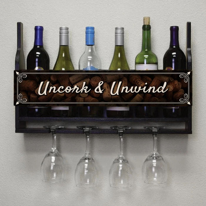This beautifully handcrafted wine rack holds up to 6 bottles of your favorite wine and 4 wine glasses (included with this shelf). This heavy-duty, high-quality wine rack offers the perfect organization option for any household. Uncork & Unwind!
