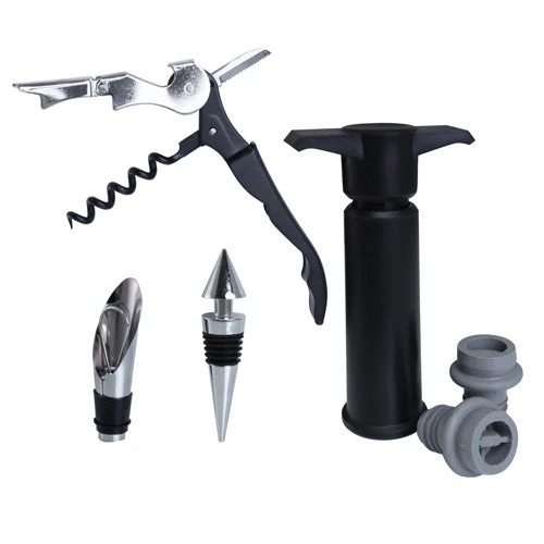 This stylish and budget priced Six Piece Onyx Wine Accessory Set is great for traveling, storage, or as a gift for wine lovers. It contains a vacuum pump, two wine stoppers, one chrome stopper, one chrome pourer-stopper, and a double lever corkscrew/bottle opener.