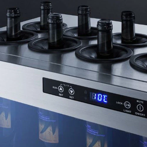 Twelve bottle countertop wine chiller with soft blue LED lighting adjust from three levels of brightness to best suit your setting. The compressor-based refrigeration cooling system ensures fast temperature pull-down ideal for use in bars, tasting rooms, and restaurants. Twelve slots let you store standard Bordeaux wine bottles in an upright position, with a tinted glass window that offers an attractive, illuminated display of the bottles’ labels. Digital controls for easy temperature management. Temperature can be set between 41 and 68ºF. ETL-S listed to NSF-12 commercial standards for use in foodservice settings. Easy user maintenance with an auto defrosting system, with control panel setting included for defrosting if the cooler is used in areas of high heat or humidity. Ask for our freight quote. Measures: 12.5″ H x 35.75″ W x 15.38″ D