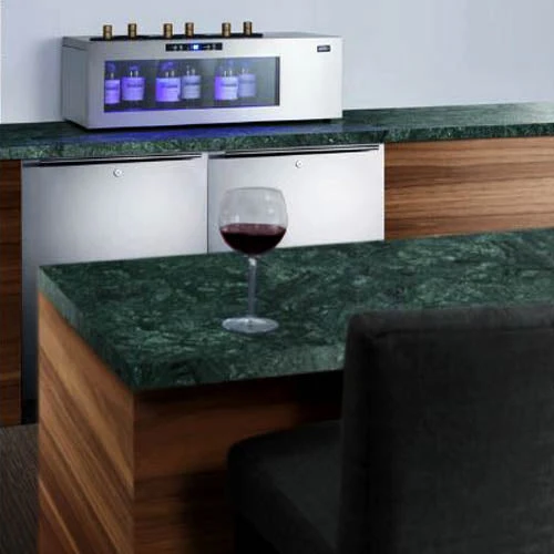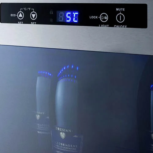 Six bottle countertop wine chiller with soft blue LED lighting adjust from three levels of brightness to best suit your setting. The compressor-based refrigeration cooling system ensures fast temperature pull-down ideal for use in bars, tasting rooms, and restaurants. Six slots let you store standard Burgundy style wine or champagne bottles in an upright position, with a tinted glass window that offers an attractive, illuminated display of the bottles’ labels. Digital controls for easy temperature management. Temperature can be set between 41 and 68ºF. ETL-S listed to NSF-12 commercial standards for use in foodservice settings. Easy user maintenance with an auto defrosting system, with control panel setting included for defrosting if the cooler is used in areas of high heat or humidity. Ask for our freight quote. Measures: 12.5″ H x 35.75″ W x 15.38″ D