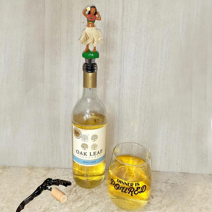 Bring the Island vibe to you and your guests with our Hula Dancer wine stopper. Fits snug in any wine bottle neck for a secure seal that will keep your wine fresh and lasting longer. Made of durable resin and features rubber bands ensuring a tight seal. Measures 6” long x 1 1/4” wide.