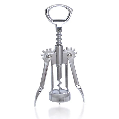 There is something about a winged corkscrew that brings a touch of class and sophistication to the table when serving a bottle of wine. This chrome plated wine bottle openers high-quality look and feel pairs perfectly with any bottle of wine. Its geared lever system with cap lifter will easily extract any cork from any wine bottle, while its sleek appearance compliments any upscale venue. It is referred to as a butterfly corkscrew, angel corkscrew or winged corkscrew because it is the 2 wings (levers) that control the entire operation. The sharp point on the screw can also be used in place of a foil cutter, while the top handle can be used as a beer bottle opener. This winged corkscrew has the vintage look people associate with wine and is the perfect addition to any bar or nightclub.
